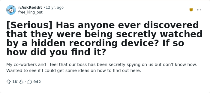At my last job I took over for a lady who retired from the company after 30 years. She told me she had always suspected our boss was either recording phone calls or had our desks bugged. He would know about things she had said during phone calls to her sister. After she was gone, there were a few occasions where he brought something up I had talked about with a coworker when he was not on the premises. I never did find any recording devices after he got sick and no longer came in.