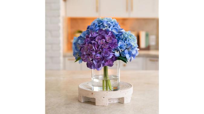 This faux hydrangea arrangement looks great year-round wherever you decide to display it. Note the incredible details, like the illusion water (also faux!) inside the vase.