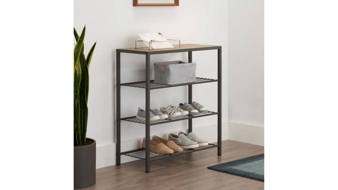 Keep shoes neatly contained on the tiers of a TRINITY shoe rack. Each four-tier rack comes with a console top for placing smaller items like mail and packages and ensuring floors stay clutter-free.