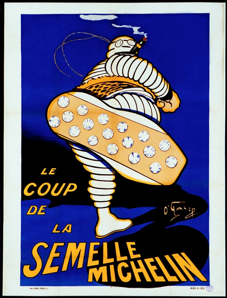1912 ad showing Bibendum smoking a cigar with nails in his foot