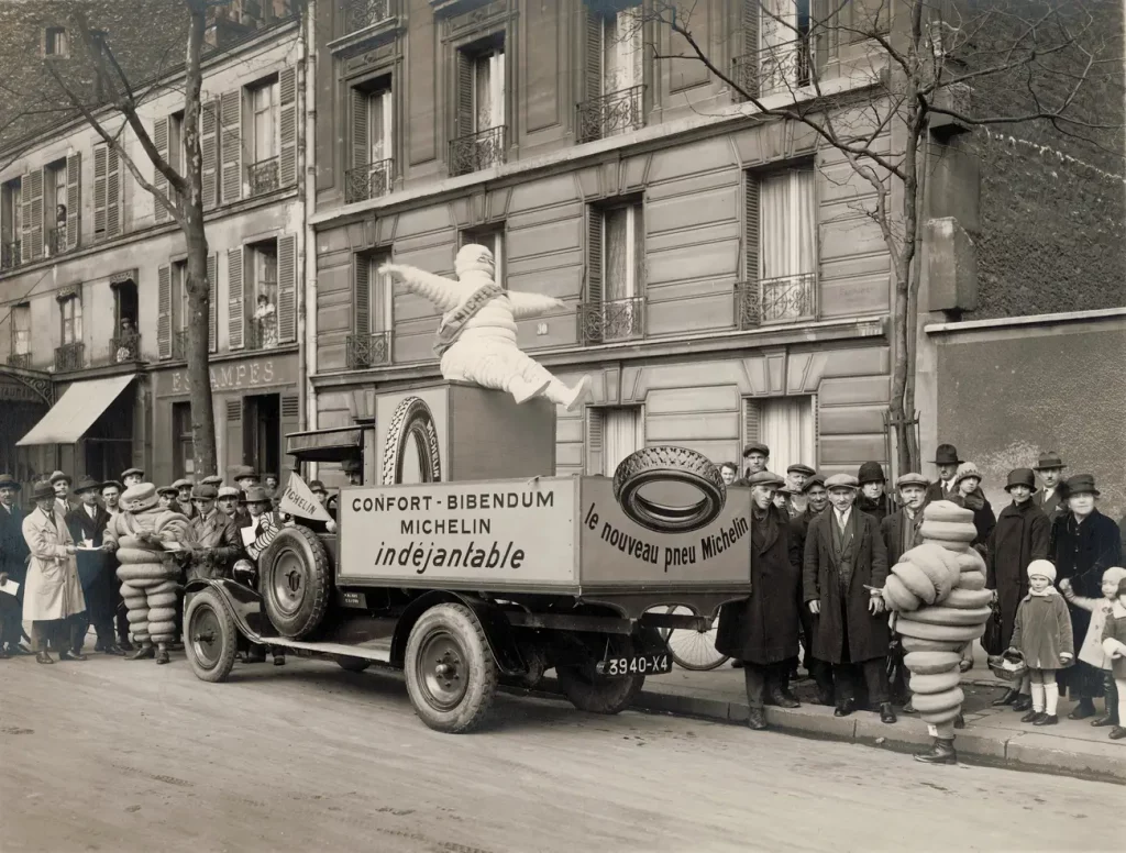 Michelin founders Edouard and André Michelin found the inspiration for Bibendum in 1894 at an auto show where a stack of tires resembled a man without arms or legs.