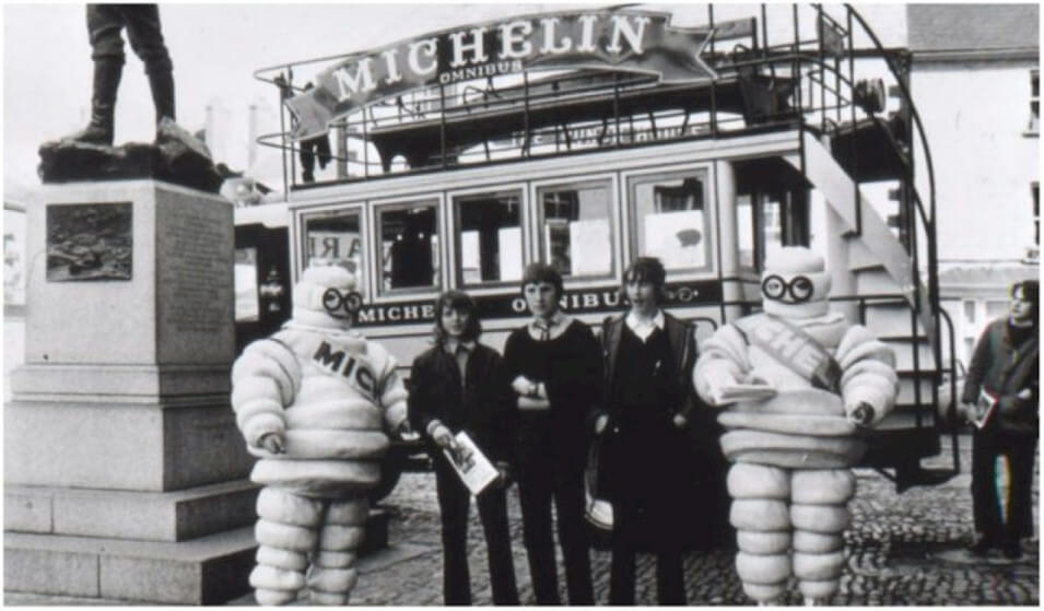 Photo of two Michelin men on top of a horse-drawn carriage advertising Michelin tires.