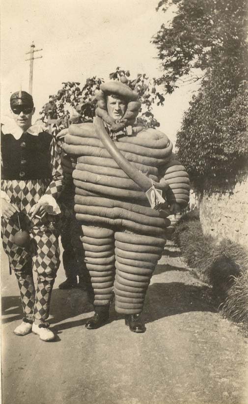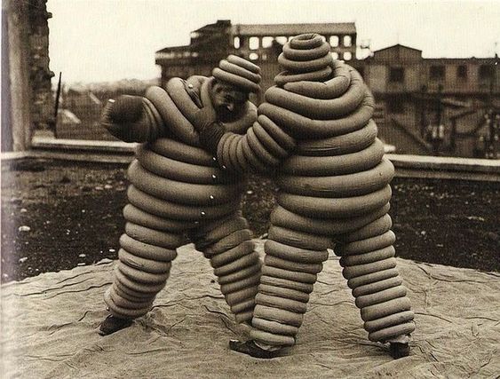 Two Michelin men pose for the camera sometime in the early 1900s.